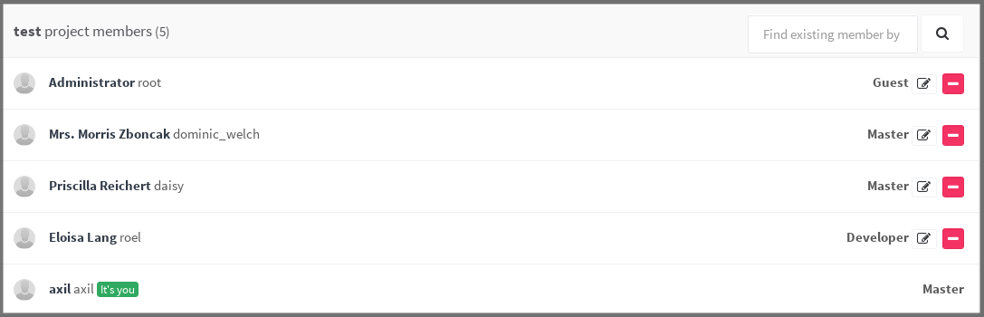 Select the one you want and hit Import project members. A flash message notifying you that the import was successful will appear, and the new members are now in the project's members list. Notice that the permissions that they had on the project you imported from are retained.
