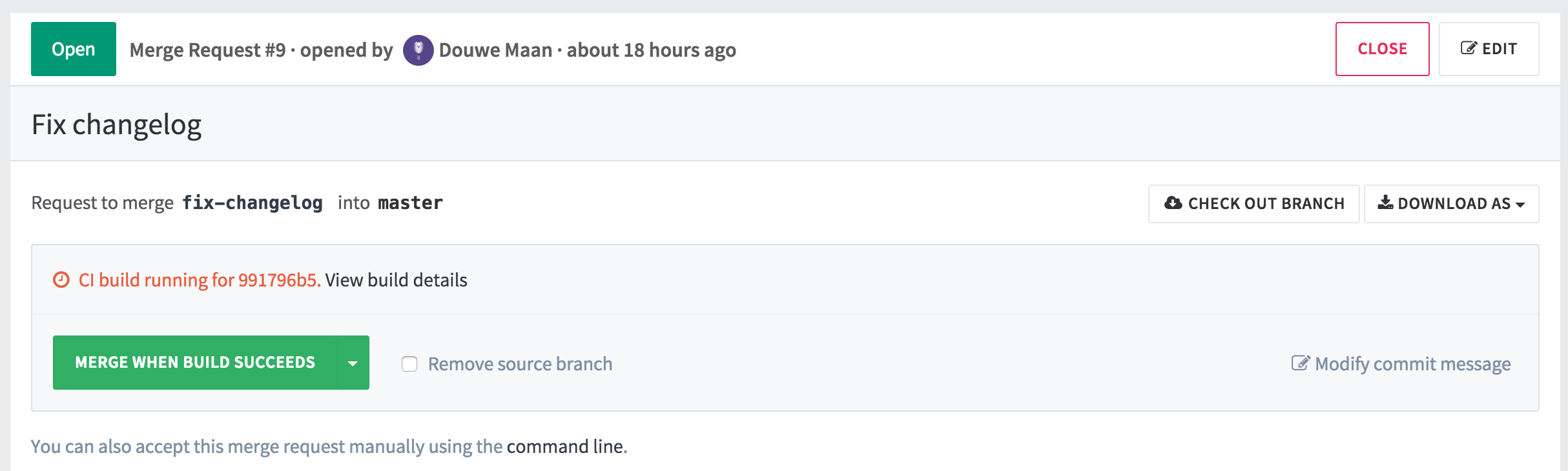 When reviewing a merge request that looks ready to merge but still has one or more CI builds running, you can set it to be merged automatically when all builds succeed. This way, you don't have to wait for the builds to finish and remember to merge the request manually.